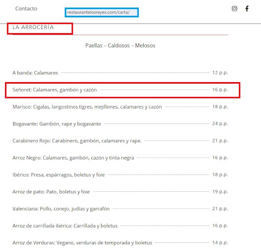 Para empeorar la situación, pedimos un arroz al señoret (adjunto en la reseña una foto de su carta en su web, que es lo mismo que pone en sus cartas físicas en el local) con los ingredientes que lleva ese tipo de arroz, y nos sirvieron un arroz que incluía dos colas de rape en medio (adjunto foto), un ingrediente que no estaba indicado en la carta.