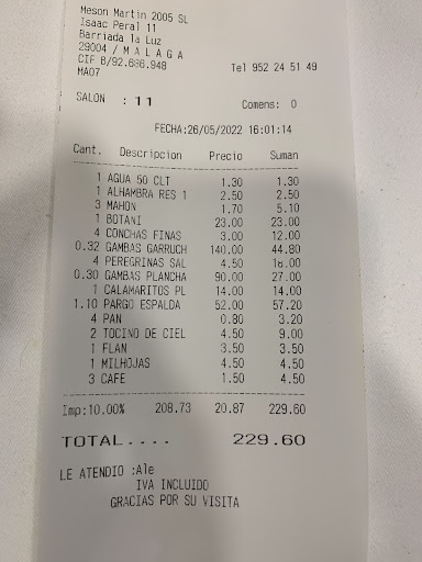 Read moreRestaurante en un barrio de trabajadores, con precios desorbitados a la calidad mediocre servida y con la picaresca del engaño que nos han dado. Hemos pedido gambas de garrucha (que no eran de Garrucha, ya que somos de esa localidad almeriense). El peso de las gambas “”rojas”” no corresponde con lo que nos han servido. Las gambas plancha más de lo mismo (calidad mediocre a precio de gambas blancas de huelva). Y ya el colmo del colmo, es que hemos pedido un pargo (el único que tenia en el expositor) y cuando hemos salido al terminar, allí estaba el pargo en la vitrina, con lo cual nos ha puesto otro esparido diferente y seguramente de otro precio más económico, y nos lo sirvieron sin cubiertos para servir. Sobre los postres decir que el tocino de cielo (no es tocino de cielo) es un flan con extra de azúcar, lo puede comprobar cualquier persona adicta a este tipo de postres como lo soy yo. Sobre el personal que nos ha servido, simplemente no es un profesional, un chico con pocas ganas y conocimientos, por lo cual mal servicio, lento y poco atento, nos ha servido el vino caliente y le hemos tenido que pedir que nos trajera una cubitera. En resumen NO recomendables. Ni el lugar es bonito para justificar esos precios, ni la calidad es la esperada a esos precios, ni el servicio es el esperado para una marisquería. 230€ para cuatro personas con esas calidades es un...