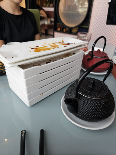Fuimos 3 personas y, cuando nos pusieron en la mesa, no sé si fue a propósito o un error, nos marcaron 2 comensales en la tablet, limitando nuestro pedido a 10 platos cuando deberían de ser 15. Le pedimos a un camarero que lo arreglase, cosa que hizo, por lo que eso, por lo menos, se pudo arreglar. Las bebidas, hasta si era de esperar, muy caras por lo que son. Un té japonés (que en realidad es una bolsita de té dentro de una tetera, nada especial) salió por casi 3 euros. La variedad es un punto positivo del lugar, cierto es que se ofrecen más cosas que en otros lugares que he llegado a visitar, pero no llegamos a disfrutar de esto. En primer lugar, la mitad de lo que pedimos no lo trajeron. Ni siquiera nos llevaron un tenedor, y ya no hablo de platos que quisimos probar pero no quisimos pedir por segunda vez por si acaso. El tiempo de espera es horrible. Supongo que es por falta de personal, ya que es la primera vez que, en un lugar de este tipo, nos hemos quedado con la mesa vacía más de una vez. Los platos, como se puede ver en la foto adjuntada, se acumulan hasta que alguien decide llevárselos. Es irónico porque pueden pasar por tu mesa unas cuantas veces antes de recogerlos. Hubo un momento en el que tuvimos más platos en la mesa que comida. Entiendo que es un trabajo estresante, pero hay personal desinteresado. Algunos son majos, otros no muestran interés alguno en ayudarte y te dedican unas miradas que hablan por sí solas. El baño tiene unas puertas que dan mal rollo, si hay algún curioso puede asomar la cabeza con toda la facilidad del mundo. La comida estuvo rica, eso hay que admitirlo. Como tal le daría otra oportunidad. Todavía necesitan mejorar algunos aspectos, pero...