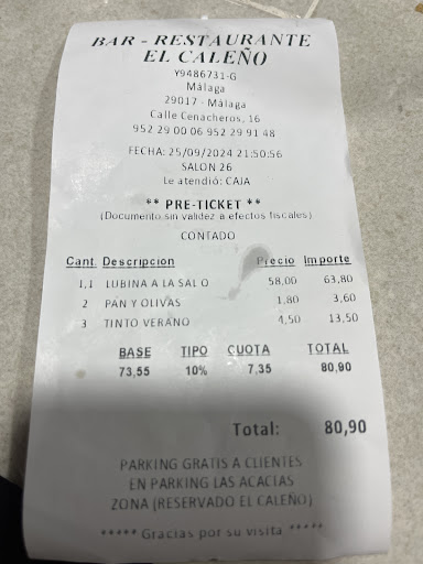 Read moreThis restaurant came recommended by some Spanish friends, but we were quite disappointed. We even took their advice not to order or buy fish on a Monday because it’s not the freshest, they say. So, even though we went on a Tuesday, the fish didn’t seem fresh and was actually quite rubbery! We can get that same quality back in Canada for calamari and baby squid!!! The mixed salad was good, the olives tasty, and the service was actually quite excellent (considering what other reviews have claimed)! Our waiter was a young guy who even helped to save us from over-ordering by suggesting the small portion of everything...water, salad, and fish. Thanks for that! Prices were reasonable, but won’t give it a second try. I have a theory that perhaps they don’t serve their freshest fish to those customers who are obviously tourists!!! Just...