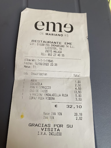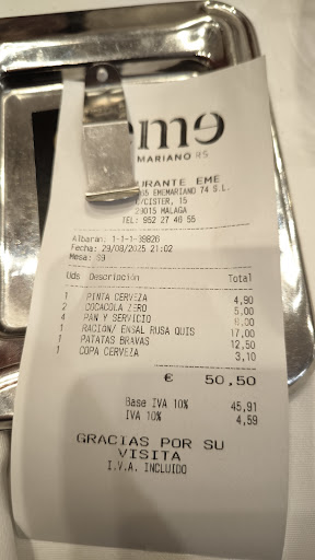 Read moreLike the Swiss would say, "Luxus Pur". It is hard to put in words the excellency of the experience. Not only the service is impeccable, not only the restaurant is quaint and nicely decorated, the highlight is the food. Each plate is the result of deep rooted competence, knowledge and selection alike, permeated with culinary culture and passion. We are happy we chose to eat at EME and we will be regular guests when in Malaga. We loved their specialty Ensaladilla Rusa (never had a good one like this one anywhere - and we are quite expert because it is also one of our favourite dishes - from Spain, where it's quite common, to the Easter European countries where it originated), spot on selection of wines, Croquetas and the exquisite Tortilla de...