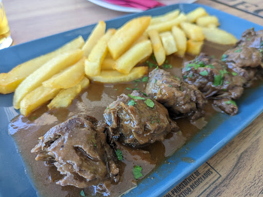 Local situado junto al Parque del Oeste, en una zona en la que es relativamente fácil aparcar. Tiene una terraza muy agradable, aunque nos decidimos por comer en el interior, muy recargado de decoración: fotos, botellas, cuadros, objetos variados y, sobre todo, una curiosa colección de sombreros de todo tipo y procedencia. A pesar del recargamiento, el salón es muy agradable y tiene un toque de originalidad. La carta es muy variada: ensaladas, gran variedad en croquetas y pinchitos, platos de picoteo, huevos rotos, revueltos, cazuelas, hamburguesas, fideos, pescados, carnes y arroces por encargo… cuesta trabajo decidirse. Los precios, muy razonables. Como íbamos para cenar, optamos por dos platos relativamente ligeros: un revuelto de trigueros con langostinos y unos fideos tostados con langostinos. Con una tarta Sacher de postre y dos bebidas, una cuenta de 23 € para dos personas. Los platos, muy correctos y abundantes; la tarta Sacher, fantástica. El chico que nos atendió, amabilísimo. Si no le doy la máxima puntuación es simplemente porque creo que con los platos que pedimos no podemos juzgar demasiado bien; no obstante, se aprecia muy buena calidad; esperamos volver para comer algo más...