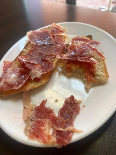 Read moreIgual de lamentable que se ve la foto, así ha sido el desayuno. Primero la espera, ha sido de más de media hora …. Pedimos dos tostadas enteras de jamón con tomate, un café con leche y un té, total 20€😅!! El tomate es de bote y el jamón no se podía ni masticar (encima tiene la cara dura de poner que es ibérico)después de lo que te clavan. De verdad que no merece la pena parar para nada, es un TIMO increíble! Si llegamos a leer los comentarios antes, desde luego que no hubiésemos parado !! No le pongo 0 estrellas porque no puedo, a ver si el dueño se digna a leer los comentarios de los clientes porque de verdad que abusa de que es un restaurante de paso y no te paras a mirar las reseñas, pero es tal cual lo indicamos mucha gente. Gente así no se merece que su negocio vaya para delante…. ya que timando no es una opción de negocio. No nos volverá a pasar y a la gente que podamos le recomendaremos no parar...