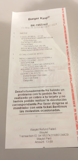No se si es política de Burger King o de este Burguer King, pero no me parece bien, que sin tener exceso de trabajo en ese momento, le digas a un cliente que NO LE CAMBIAS dos de las tres botellas que le habéis dado del mismo color, con el mismo personaje, (y que ni siquiera te pide que le busques un color en concreto, que le vale con los primero que encuentres y que sean distintos). Tampoco pide que si encuentras, por alguna casualidad de la vida, una dorada que se supone que tienen premio (mas coronas para comprar mas hamburguesas, super-premio), la entregues. Lo que quiere el cliente son las de colorinchis normalitas, que son las que les molan a los crio, y es abrir la tapa, ver tú, como dependiente, el color que tiene y decir si esta repe o no, si es dorada te callas y a correr, al que le toque le ha tocado.