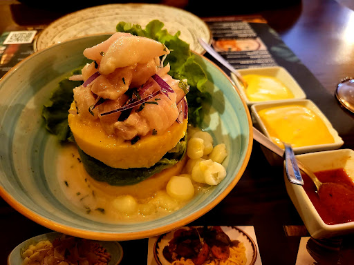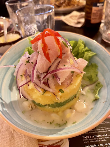 La comida ha estado exquisita. Hemos pedido un ceviche mixto, (hay que advertir si lo quieres con picante o no), una causita acevichada, plato de pescado marinado sobre un timbal de puré de patatas y aguacate, que me ha sorprendido gratamente (en especial la mezcla, con una muy bien elaborada leche de tigre).