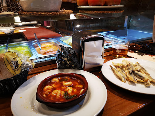 Read moreAmong the tapas bars we visited, this place had an outstanding atmosphere, reminiscent of what you see in videos. The waiters were pleasant and kind. Our overall experience was positive. Arriving around 2:30-3pm, we found the place full. We were given a buzzer to alert us when a table became available. While waiting outside, we placed our order. Once seated inside, our food arrived promptly. We ordered three dishes: Malaga prawns: These were disappointing. For nearly 30€, we received 250 grams (with shells), equating to 14 shrimp-sized prawns. They were simply boiled and unremarkable in taste. Grilled lamb chops: Recommended by the waiter, these had an overpowering meaty taste. The meat on each chop was sparse, no more than half a small matchbox in volume. The fries that came with it on the other hand were super tasty. Overall it is not worth the price. Grilled octopus: This was exceptional - one of the best we've had. The accompanying golden potatoes dressed in olive oil were perfect. Our bill totaled 75€, which seemed high for the portion sizes. However, the excellent atmosphere, service, and the outstanding octopus dish...