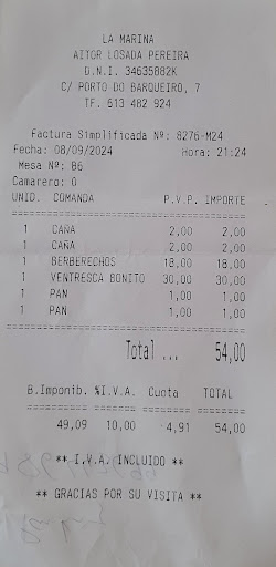 Read moreLlevamos años yendo a celebrar el día de Asturias a Galicia, (raro, ¿no?). Nunca habíamos llegado tan lejos, no sé muy bien como caímos ahí, (conducía mi amigo). Había cuatro restaurantes en poco espacio, entramos en este, no había mucha gente. Tardaron un poco en venir a atendernos, la carta es un poco cutre en su aspecto, parece que la imprimí yo en el ordenador. Pedimos unos entrantes, calamares y pulpo, los calamares normalitos, el pulpo buenísimo. De segundo, una ensalada mixta para cuatro, dos entrecots, una picaña y un bacalao. El bacalao, (que fue lo que comí yo), estaba exquisito, ración abundante. Los entrecots estaban poco hechos, demasiado poco, según opinaron los que los comieron, pero no quisieron pedir que se los pasasen algo más. Postre, una botella de Ramón Bilbao, (que nos bebimos mi acompañante y yo), y otra grande de agua. 162,50 €. Algo más de 40 € por cabeza. Creo que está dentro de lo normal. Con hambre no quedamos… Como crítica: tardaron mucho en servir los platos, y no estaba lleno ni mucho menos. Entramos a las 15 y salimos a las 17,30. Tampoco teníamos prisa, pero sí, muy lentos en servir los platos. El servicio, peculiar,...