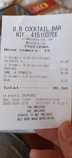 Read morePedimos una hamburguesa de ternera con queso cheddar, pensaba que vendría acompañada con cuatro patatas, pues bien, te la sirven cortada por la mitad con una hoja de lechuga, una rodaja de tomate y bañada en un plato con el queso bastante malo, por cierto, la carne como una espátula y de mala calidad, por lo menos al paladar. Por no decir lo poco apetecible a la vista. Para los 2 niños, uno de ellos de 3 añitos pensábamos pedir una sencilla para compartir con el otro. Nos dijeron que tenían hamburguesas infantiles entonces pedimos una para cada uno pensando que serían pequeñas. Pues bien son igual de grandes que las demás pero sin lechuga y tomate. Eso sí, estás si las sirvieron con 4 patatas. 10€ cada una!!... El crío de 3 años dejó más de la mitad. Para beber pedimos agua, nos sirvieron tres botellitas de vidrio con 50cl de agua cada una de esta que rellenan con tapón de rosca. Por cada botellita 3'50. 10'50€ por 1'5l de agua de grifo, pero con la tontería de estar filtrada, a 3,5 por cada una! Menos mal que no pedimos 3 refrescos,si no, no se lo que nos habrían cobrado. También pedimos 2 ensaladas de pollo que a eso no le pongo ninguna pega estaban bien de precio y de guarnición. Tampoco están muy pendientes, hemos tenido que pedir las servilletas, ketchup, porque ponían una miseria y otra silla para no estar apelotonados . El total por una hamburguesa de ternera nada apetecible 2 hamburguesas infantiles, 2 ensaladas de pollo y 1'5l de agua 76'50€ Para no repetir. La cara de cada cliente al recibir la cuenta era de risa, menos está vez, que tb me ha...
