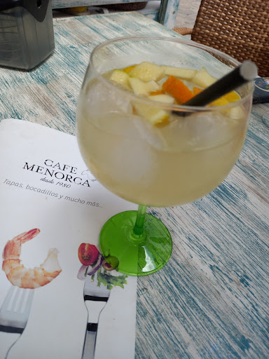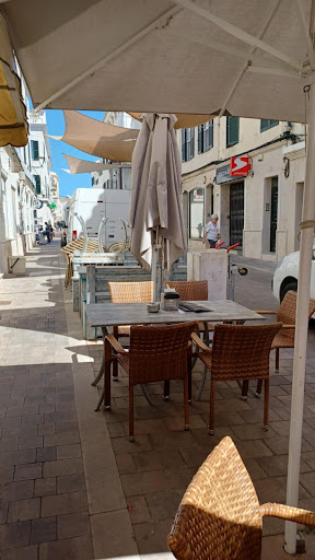 This was my 1st visit here & we sat outside at one of the 8 available tables,initially I just only ordered a couple glasses of Cava Sangria and received very pleasant table service.Also viewing the extensive menu options it was our intention to return back later for some lunch.A change of mind soon came about after seeing other customers having their food served. An order choice of Bruschetta (tomato, garlic & basil )along Nachos with cheese & chilli con carne both to share was placed before our drinks had arrived. I found the glasses of Cava Sangria (€5 each)which had ice & fruit (lemon,orange& apple bits ) to be very disappointing in taste,very weak infact more like a watered down non alcohol soft drink than a traditional Cava Sangria delight.Food wise the 2 slices of Bruschetta were over loaded with a mountain of freshly chopped tomatoes which made the bread soggy,another disappointing order but we found the Nachos to be very nice .The inside bar area also does have about 4 or 5 tables .I also found out when paying the bill that a 1euro additional charge had automatically been added for the terrace service ! It's the 1st time after many visits to Menorca I've come across this happening when dinning out.The single toilet facility inside was clean but had run out or wasn't stocked with hand paper towels during our visit .The staff on duty were very pleasant & spoke very good English but I wouldn't return back again after this lunch time...