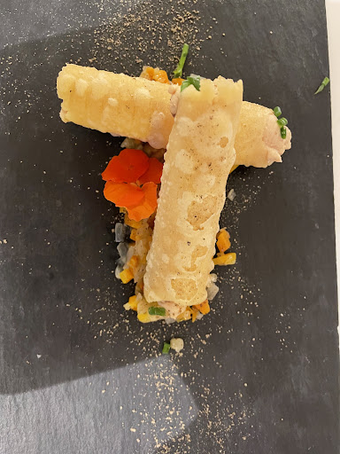 Read moreThe place is nice and have a elegant and cool atmosphere, relaxing and chilled. Perfect environment to enjoy the conversation at the table. The food is just so-so. My monkfish was slightly undercooked, bland and the side was so simple and not well-thought (4/10), the octopus was really good and well served (7.5/10), the mackerel was salty (5.5/10) and the starter (gazpacho) was good but lacked visual preparation (6/10). The services was okay, but the owner charged us 4.5 euros for tap water (claiming they have a filtering system), but it is tap water in the end and Mahon’s tap water is not drinkable, and she argued with us quite rudely, which was wrong and extremely unprofessional because it was our feedback. The wine menu lacks some quality and it is overprice for the below average wines they have. The presentation of the dishes was nice, and the desert...