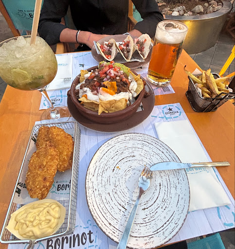 On our way to the riverside, we'd stopped at the square and sat in one group of seats, turned out another cafe, Palmeres, because on the way back chose different seats turned out to be for Es Borinot. Service was ok, less friendly than on the other cafe. No popcorn or other gratis nibbles here whilst the other did. It was a case of beer, chill, pay your bill. Preferred the other cafe. Although when we went to use the toilet and went to the Palmeres adjacent to Es Borinot, were hastily ushered out to Es Borinots toilet! I get it but wasn't obvious and was it a problem? Owner asks if I have confused the location? No, have checked. Es Borinot is on the square, sharing the seating area with the adjacent cafe and where you sit determines which cafe engages with you. The above outline of our 2 visits shows this and...