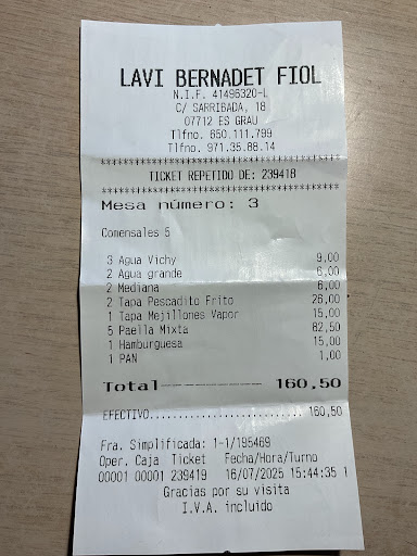 Por recomendación de un amigo que visitó el lugar hace diez años, grupo familiar de seis personas reservamos mesa a primera hora de la mañana. Llegamos a la hora pactada (14:30 h) y la encargada nos dice que la mesa aún no está preparada, que nos sentemos dentro, en una mesa de cuatro, pidamos refrescos y alguna tapa para entretenernos. Nos lo dice tan autoritariamente que obedecemos. Al poco rato, después de pedir las bebidas con tapas de mejillones y pescadito frito, vemos que dentro se está más fresco (con el aire a condicionado) que afuera (una tarima de no más de dos metros de ancho con un viejo toldo que casi no tapa el sol y rozando los coches que circulan por la calle). Con mala cara la encargada nos “autoriza” a quedarnos dentro y, a petición nuestra, arrastra y acopla una mesa más. En un extremo de esta última mesa deja 6 platos con seis cubiertos y seis servilletas. Sin manteles de papel ni mucho menos de tejido, nos hace ademán para que nos repartamos los platos. Los vasos serán los mismos que los de los refrescos. Vasos, platos y cubiertos directamente sobre la madera barnizada de la mesa. Al final llega la “paella mixta de arroz”: que decepción ! El arroz con muy poco sabor parecía previamente hervido y añadido al sofrito antes de servir. Las gambas era necesario buscarlas con lupa de lo pequeñas que eran. Los trozos de costilla de cerdo duras y astillosas. Los mejillones normales. Uno de los comensales, a quien no le agrada el arroz, pidió hamburguesa y aún no me creo la mala cara que le pusieron por pedir previamente un cambio en el acompañamiento. Los camareros y la propia encargada se iban tomando vasitos de cerveza en la barra mientras comíamos y se molestaban al pedirles más bebidas o más pan. Ya hacía el final de la comida nos dimos cuenta de que habían cerrado el aire acondicionado y estábamos los seis literalmente empapados de sudor. Pedí muy amablemente si podían subir el aire porque hacía mucho calor. La respuesta fue que no se podía. Sin más explicaciones. Evidentemente, ni postre ni café. Salimos de estampida a la calle para no caer desmayados. Eso sí, después de pagar religiosamente la abusiva factura que adjunto para que ustedes juzguen. No tuve ni fuerzas para pedir una hoja de reclamaciones. Por cierto, no quiero olvidarme de mencionar una de las cosas que considero muy importantes en un restaurante: el estado de los lavabos. Situados en un patio lleno de cajas viejas y otros trastos, eran minúsculos, sucios (al menos el masculino), y mal olientes. Solo me queda decir que eso no era un restaurante. Casi no llegaba a bar de segunda. No lo...