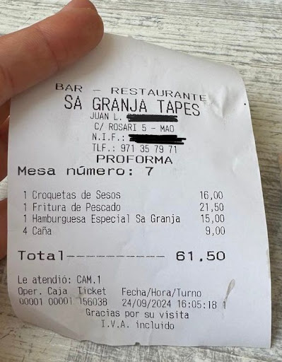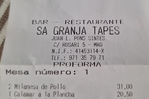 Stopped to eat at Sa Granja Tapes whilst visiting Mahon, weather was terrible but in October you do run that risk. A little gem hidden away in a picturesque setting, I had the gourmet cheeseburger and my wife had a tuna, lettuce and mayo baguette with some chip's and 2 cheeky large estrella's. The food was first class, burger was home made, juicy and cooked perfectly in a toasted brioche grained bun with fresh salad. Baguette was more than enough so my wife saved half for later. Chip's plentiful and tasty and complimented the meals perfectly. Beers served in frosted glasses and all for less than €30, with superb service thrown in. If in the area pop in you...