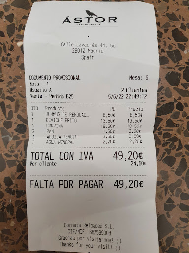 Read moreOn my first evening in Madrid I was lucky to get this recommendation at my hotel, where the receptionist somehow managed last moment to reserve me a place at the bar. From the moment of arrival on I was treated both professionally and friendly by all staff members, if by the barmen, the waiters, the hostess, each and everyone is pleasantly welcoming and involved. I kind of made my decision n advance, while reading the menu outside as I was waiting for the restaurant to open, but I was still well advised regarding my choices. I took the Astor salad, refreshing mix of greens and fruits in a tasty honey sauce, which I enjoyed to the last bite. Then I had a second first plate, the beef meatballs with Parmesan, which complimented the salad wonderfully. I treated myself with sorbet for dessert and received a liquer on the house with the bill, which I found to be fair for the quality of the food, and the aesthetically pleasing serving. Reservation in.advance...