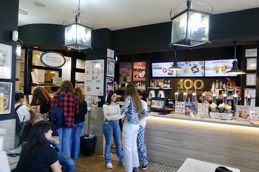 Read moreOne of the best montaditos in Madrid, despite being one of the busiest. The (Peruvian, I guess) guy with the glasses is an efficient maestro at taking orders and making coffee and juice . Even if the queue is out door you don't wait as long as you do in other montaditos where the staff do not have experience.they also make the coffee good and strong. One of the best sunshine terraces in the morning. Tables are battered chrome circles but that adds to the character and the staff clear them very regularly, if they don't the pigeons will smash everything. Great spot for people watching as 10s of 1000s flow by coming and going to atocha. Best place to wait for your train drinking beer eating olives and chips. Clean...