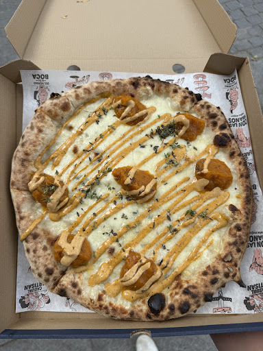 I was at this restaurant shortly before closing time and could only order takeaway. I was at this restaurant shortly before closing time and could only order takeaway. Ich war kurz vor Ladenschluss in diesem Restaurant und konnte nur Essen zum Mitnehmen bestellen. I was at this restaurant shortly before closing time and could only order something to go. Ich war kurz vor Ladenschluss in diesem Restaurant und konnte nur etwas zum Mitnehmen bestellen. I actually wanted to order a classic pizza. The guy who took my order recommended a white cheese pizza with pumpkin puree and some kind of paprika sauce on top. I don't usually follow such recommendations, but in this case it was a good decision, because the pizza tasted excellent! It consisted of two types of cheese and the ingredients already mentioned. It was garnished with fresh thyme. Well done...