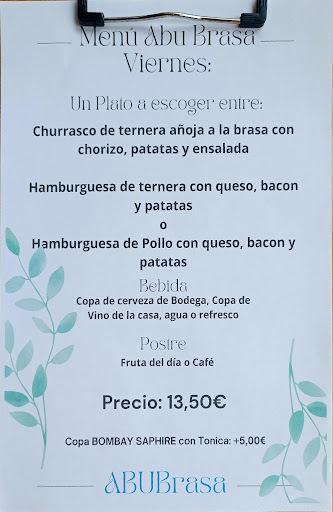 Read moreEstupendo lugar al que nos llevo nuestro sobrino de 8 años😅👏🏾 🫶🏾 resulta que su amigo del cole que es hijo de los dueños de Abu Brasa le comento del local de sus padres , pues resultó ser un DESCUBRIMIENTO, hemos venido a cenar el día martes y hemos salido encantados de ver que aún hay sitios que mantienen su esencia,y sus ganas de crear en la cocina son lo que más se nota aquí, hemos comido carne de la buena y de alta calidad 100%, unos fingers de pollo de Verdad con un rebozado hecho a su justa manera ( de los que no comerás en otros sitios ) unos nachos 😍 y entre tanta comida, llegó el postre , un brownie de pistacho que nunca habíamos probado,pues este es único 🫶🏾 un mousse y un coulant de chocolate 🫶🏾🫶🏾🫶🏾 además el jefe es una persona con mucha sencillez y simpatía, nos aconsejó tan bien que todo nos pareció genial , la camarera una chica súper maja y atenta, nuestro viaje relámpago desde valencia se volverá a dar y seguro volveremos, esta más que claro. Y también quiero destacar que es un sitio tranquilo y muy limpio, eso siempre da confianza y ganas de volver a un sitio . Muchas gracias por la atención y por darnos de comer tan tan tan bien ! Enhorabuena y que nunca perdáis vuestra esencia 😊. *No hubo tiempo de sacar fotos, eso indica que estaba demasiado bueno para hacerse...