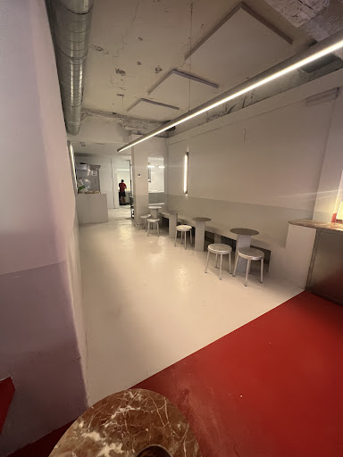 music & style: both great - young, chill and modern music that accompanies the well decorated brutalist style in red and white cafè.