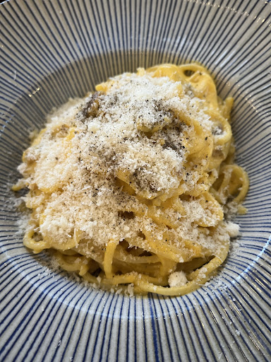 Read moreAl haber oído hablar muy bien de este restaurante italiano llevaba tiempo queriendo venir a degustar sus platos, pues se encuentra cerca de la zona de Madrid en la que resido (cerca del metro Conde de Casal). Aprovechando un cumpleaños familiar, fuimos a comer esta Semana Santa y la experiencia fue maravillosa. Como aperitivo, para acompañar el pan que te sirven, te ponen un aceite especiado por ellos, que combina a la perfección con sus panes. De entrante, leyendo críticas sobre el establecimiento, había visto que mucha gente destacaba sus mejillones en salsa de tomate (en la carta denominados “cozze alla tarantina”) y la verdad que no me extraña que así fuera, porque estaban increíbles. Los mejillones estaban bien de cocción, pero lo realmente destacable del plato es la salsa de tomate que acompaña a los mejillones: tiene un sabor buenísimo, ligeramente picante pero soportable para aquellos a los que no le gusta el picante. Me faltó pan para poder mojar toda la salsa que traían. En cuanto a los principales, pedimos 3 platos diferentes para probar mayor variedad: “spaghetti alla carbonara con croccante di guanciale” (los clásicos espaguetis a la carbonara), “maccheroni con crema de pistacchio e guanciale” (macarrones con una crema de pistacho y queso mascarpone) y “pizza parmigiana” (pizza con berenjena y mozzarella). Empezando por la carbonara, estaba realmente buena, bien cremosa y con los ingredientes verdaderos que ha de llevar una carbonara tradicional. Siguiendo por los macarrones, me sorprendieron gratamente. Pasta cocinada ligeramente “al dente” (ideal en este tipo de pasta), combina a la perfección con la salsa que llevan. El queso mascarpone le aporta gran cremosidad y el sabor del pistacho está realmente presente. En cuanto a la pizza, también estaba muy rica. La masa es esponjosa y crujiente y los ingredientes que lleva son de buena calidad. Aunque ya estábamos llenos, no pudimos resistirnos a pedir de postre el clásico tiramisú italiano. Estaba muy bueno, contrasta muy bien su cremosidad y sabor con las galletas troceadas y el cacao espolvoreado. Servicio bueno y atento por parte del personal. En definitiva, un referente dentro de la cocina italiana en Madrid, con una relación calidad/precio excelente (pese a que los platos puedan parecer caros, las raciones ofrecidas son...