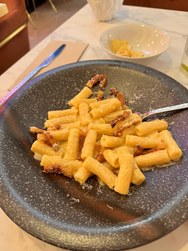 📜 La carta puede consultar👀 completa en su web🌐, con precios incluidos 😉 Es muy extensa, gran variedad de entrantes🧀🥪🍆, pastas🍝 y risottos🥘, pinsas romanas🍕, carnes🥩, pescados🐟 y postres🍮 Aquí puedes venir hasta con el amigo👯 que suele pedir menú de niños porque si alimentación está muy limitada😂 Algo se le tiene que acoplar 🙂 Nosotros éramos 3 personas y probamos: Burrata🧀 Me encantó, posiblemente el mejor plato de nuestra comida🤩 La textura es de 10. Eche de menos algo más de aliño, pero la recomiendo. Carbonara🍝 La auténtica, con yema de huevo🥚 y guanciale🐷 El guanciale es de los mejores que he probado🔝 Recomiendo la carbonara solo por esto, aunque hubiera preferido spaghettis. Pinsa Italicus🍕 Está bien compartir una pizza y una pasta para probar más parte de la carta. Raviolo ricotta spinaci. La salsa parecía casera 🤩 Tiramisú Settimo cielo. Está bien. Tiene una base de galleta triturada🙂