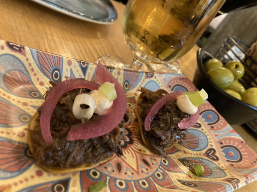 We stopped for a small lunch at this table clothed restaurant. The food, with fancy descriptions, unfortunately, was average. We had Tostaditas de jarrete de ternera con crema de aguacate, cebolla roja encurtida y mayonesa de chipotle (2 pc, shredded braised veal shanks on tortilla chip, Mayo without any chipotle flavoring, 7eu), Croquetas de gambas al ajillo (2pc shrimp and garlic croquette, light n creamy w/very little garlic flavor, 7 eu), Empanadas de carne estilo criollo, muy jugosas, acompañadas de chutnay de tomate (flaky empanada with bland minced beef filling & mediocre tomato chutney that was not a good accompaniment to the empanada, 7 eu). Excellent bread and olives was 2.80eu per person. Wine 3eu and house beer 3eu (?) was reasonably priced. Unless you are in this neighborhood, I would give...