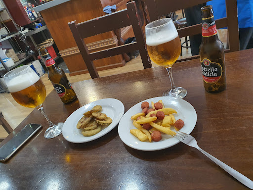 Nada más sentarnos en nuestra mesa vino un camarero y nos puso dos platos de pincho y nos tomó nota de la bebida. Se agradece muchísimo que no estés esperando sin poder tomar nada, la atención fue buenísima. Pedimos para comer vieiras, croquetas de carabineros y pulpo de feria. No tenían el pulpo disponible y pedimos gambones para sustituirlo. Adjunto foto, pero las vieiras estaban riquísimas, las croquetas estaban bien, aunque a nosotros no fue lo que más nos gustó. Entre algún plato y otro, si ya terminamos y faltaba para el siguiente, nos volvieron a poner un pincho en la mesa para que no sintiéramos esa espera. Hasta en dos ocasiones nos trajeron estos pinchos que digo. Los gambones muy muy ricos también (aunque es verdad que no se pelaban solos). Observamos que tenían un botellón enorme de vino blanco y les pedimos probar una copa, y estaba riquísimo, lo recomiendo pedir. Por último, de postre pedimos tarta de Santiago (muy jugosa para ser bizcocho) y las filloas (creo que se escribe así) que me las sirvió con una jarita con licor prendido en llamas, y luego lo vertió por encima de las filloas. Buenísimo!