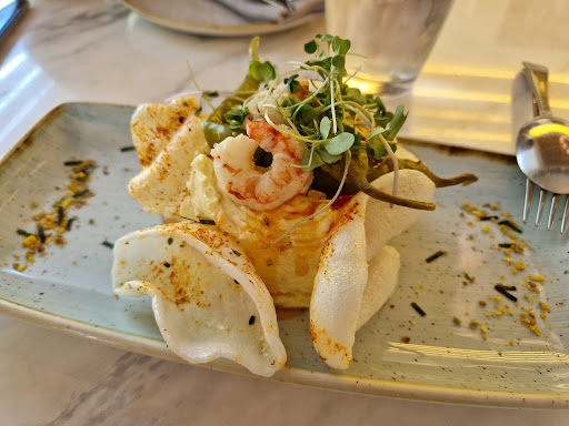 Ensaladilla rusa de langostinos: Tiene una textura muy agradable. En vez de atún tiene langostinos picados, lo cual suaviza el sabor, y hace buen contraste con las piparras y la salsa dulce/picante.