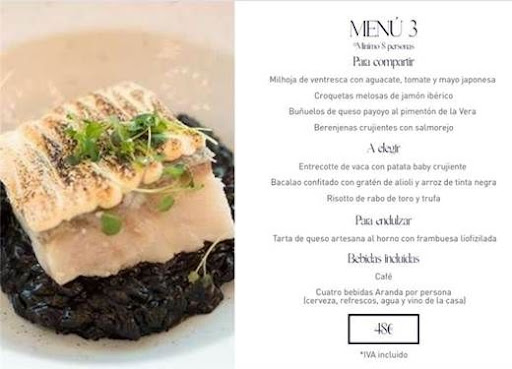 Acabamos de estar en una cena de empresa. Y ya se sabe que por Navidades se abusa de los precios, pero uno espera que al menos la calidad sea razonable. No ha sido así. El lugar es muy agradable y los camareros son profesionales y van uniformados. Aunque había demasiado ruido. En estos sitios no terminan de poner paneles para el ruido y cuando hay muchos comensales es muy complicado hablar. Aunque no es de los peores sitios en los que he estado El pan estaba bastante bien, de varios tipos y muy rico. El vino también: un Rivera del Duero. los primeros para compartir han estado bien y son sabrosos: milhoja de ventresca con aguacate, tomate y mayo japonesa, croquetas melosas de jamón ibérico, buñuelos de queso payoyo al pimentón de la Vera, berenjenas crujientes son salmorejo. Yo los veo escasos, ya que fueron 2 croquetas y un buñuelo. Si bien son bastante elaborados, no se pude decir que los ingredientes sean muy caros. Creo que hubiera sido razonable poner alguna croqueta y buñuelo más. Pero lo que es inaceptable es el segundo. Pedí un entrecote que era pequeño y me dejé la mitad porque tenía muy poca carne y mucha, demasiada ternilla. Además, no estaba tierno, sino duró y hasta costaba partirlo con el cuchillo. Es una pena que no tirara una foto. Y la carne de las personas que estaban a mi lado, aunque estaban un poquito merjor, también estaban escasas y duras y con demasiada ternilla, aunque no tenían mal sabor (menos mal). Me dijeron que al menos uno de los otros segundos como el pescado, bacalao confitado con gratén de alioli y arroz de tinta negra, si estaba bueno. Ya estamos acostumbrados a que en este tipo de cenas nos cobren en exceso, pero no me termino de acostumbrar a que además la calidad sea mala. Todo esto costó 48€! Sinceramente me sentí un...