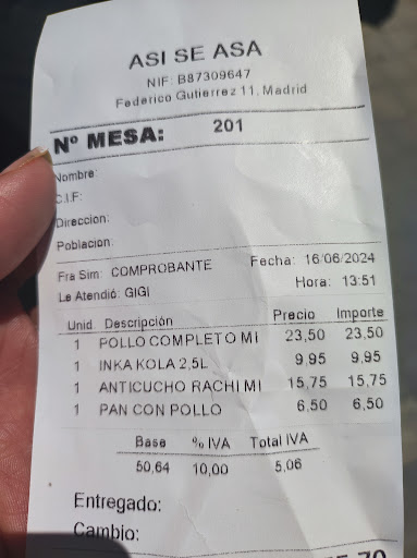 Acabo de ver el ticket y me doy cuenta ahora mismo de que me han cobrado una inca kola grande cuando no había y tomamos una inti cola pero bueno eso es culpa mía por no revisar el ticket.