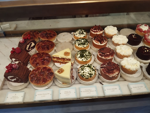 🌁 El local es un local mediano situado en la calle Velázquez. Con gran cantidad de cristales, decoración navideña y brillos es un sitio bonito y en un enclave perfecto. Los asientos son cómodos aunque algunas mesas están demasiado cerca (prácticamente se solapan las conversaciones) Dispone de una barra de mármol, varios expositores y en general está en buen estado.