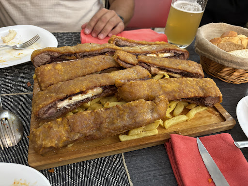 Hace unos días mis compañeros y yo tenemos la terrible suerte de dar con este lugar. Veníamos de viaje con el tiempo un poco justo para comer algo antes de trabajar. Tras echarle un ojo a la carta se decide compartir un cachopo de 35 euros. Lo pedimos y nos ponen unos trozos en un bandejon de lo que se supone que es un cachopo sorprendentemente grande encima de unas patatas fritas tristes, blancas y crudas. La carne sabía como si estuviera medio podrida y claramente refrita varias veces. Seguramente la bandeja estaba compuesta de sobras de otras raciones que se dejaron clientes desde incluso algunos días anteriores. Por supuesto lo dejamos prácticamente entero. Era incomible. Cuando voy a pagar veo que cuesta casi 80 euros. Pregunto que qué pasa a la camarera porque pedí el de 35 euros y se mete en la conversación el dueño sin dejar hablar a la camarera que acacha la cabeza avergonzada, diciendo que el de 35 euros es de un kilo y el que nos sirven es de 2,2 kg. Le contesto que por qué nos sirven ese si pedidos el otro. Qué por qué razón íbamos a querer comer mas de medio kilo de carne (podrida) por cabeza. No contesta y se queda tan pancho. Cometí el error de pasar la tarjeta antes de revisar el ticket. Además lo pedimos de jamón y nos lo pusieron de cecina con toda la cara, otra razón por la que pienso que ese era el que tenían hecho de sobras de otras mesas. No quise discutir porque realmente estaba muy disgustado por la estafa de la que acababa de haber sido presa y la discusión podía ponerse fea, además de que no tenía el tiempo ni las ganas. En fin, una pena que llegues a un sitio para comer y a la primera de cambio te estafen porque tienes acento de otra comunidad y saben que estás de paso. Me parece una garrulada de cuidado y mis peores deseos para hosteleros que practican estás malas artes. Intenten evitar este lugar, consejo de un anónimo estafado. De lo contrario puedes acabar estafado, en el hospital o...