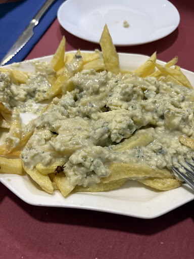 Las patatas al cabrales son patatas fritas blandas a las que les han vaciado encima una lata de queso azul del supermercado, sin ser salsa ni nada, un mazacote salado. Los pimientos de padrón llenos de aceite por dentro.