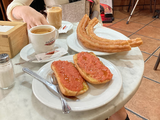 2️⃣ Aunque también sirven comidas, en esta ocasión fuimos a desayunar, pues vimos que era un sitio de referencia en el barrio para ello. Por 10€ pudimos tomar dos cafés (uno descafeinado y uno normal), dos chocolates pequeños, una barrita con tomate (las dos mitades), una ración de cuatro churros y un plato con dos tortitas.