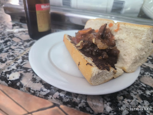Pedimos los famosos bocadillos de morcilla con oreja y también unos entresijos frititos. Desafortunadamente, la calidad de la comida no estuvo a la altura de nuestras expectativas. El pan en los bocadillos era tan blando como un chicle, claramente del día anterior y almacenado en bolsas de plástico para evitar que se endureciera. Este detalle le restó mucho a la experiencia.