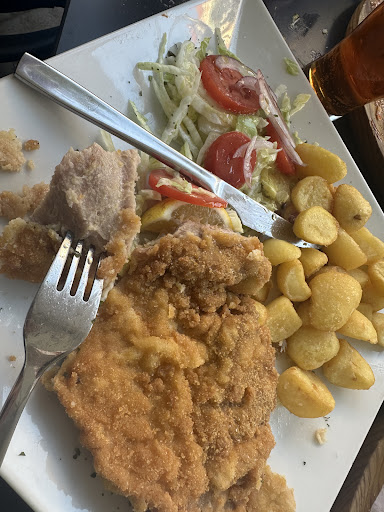 “Comimos “ ayer 06/12/2024 con dos amigas y mi hija, pedimos yuca frita con dedos de queso . Las camareras simpáticas pero nada atentas , Les pedimos una cuchara para la salsa de la yuca para no estar todas metiendo el cacho a la salsa y nunca llego ( la pedimos 2 veces) . Los platos ENTRANTES tardaron 40 minutos en salir DE RELOJ ! pedimos 2 hamburguesas de la casa , una de ellas para mi hija de 11 años solo pan -queso - beicon y carne ! Me la trajeron con cebolla, mayonesa mostaza ketchup … mi hija es alérgica a la salsa y la mayonesa lleva huevo , así que tire el pan y le limpie la carne con el cuchillo en fin un despropósito totaaaaal … hablemos de las chuletas vallunas estas que pedimos mi amiga y yo …. QUE DECEPCIÓN …si podéis apreciar en las fotos la carne estaba EN MAL ESTADO ,,, tras darle un mordisco le dije a la camarera que por favor oliera la carne .. osea olía a comida en mal estado a filete en nevera con olor fuerte .. me pidieron disculpas las chuletas de CERDO se frieron en aceite de pescado .. osea enserio ? 1h30 para traerme dos chuletas fritas en -aceite de pescado ? En fin y digo 1h30 xq tardaron 40 minutos en traer los entrantes y por lo menos otros 40-50 en traer los platos.. una vergüenza ! Decíamos bueno esperemos que la espera por lo menos esté riquísimo y buenooooo Obviamente nos querían cobrar 74€ después de llevarse los platos enteros y nuestras quejas al respecto … lo que dijimos que como puede ser. ? Si os devolvimos 1 hamburguésa con 1 mordisco, la otra hamburguesa con media carne sin el pan que lo tuvimos que tirar porque venía llena de salsas las cuales dijimos que no hechar porque es alérgica …… las chuletas Vallunas completo y los otros … mi amiga solo se comió El pan de lo mala que estaba la carne de la hamburguesa sabía como a embutido , y mi hija solo la mitad de la carne por que tooooooodo el pan estaba con miles de salsas .una vergüenza de lugar ! Pagamos obviamente por lo único rico : la yuks frita y los dedos de queso , las bebidas y pues lo q les dio la gana de meternos de más : 36€ de los cuales solo comimos la yuka que eran unos 8-9€ y los dedos de queso otros 8-9€ no recuerdo bien y 2 nesteas / 2 refrescos . Que no llevarían ni a los 30€ …. . Jamás volveremos ... en la foto en la que salen todos los platos fue como lo dejamos ! La hamburgués derecha con un mordisco sin pan xq fue lo único q comió mi amiga el pan., mi hija la de la iz que comió media carne de hamburguesa y el pan lo tiró a la basura porque le hecharon salsas y es alérgica . Así...