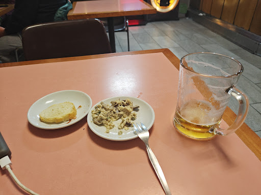Cada vez que lo pienso me apetece más, estar en ese bar, por una jarra de cerveza, que es lo que yo aconsejo pedir te ponen hasta arriba las bandejas de cosas grasientas y tan sabrosas que no te dejarán escapar, salchichas patatas fritas, incluso calamares he visto que recién hechas sirven de aperitivo para digerir la caña, en mi opinión mejor...