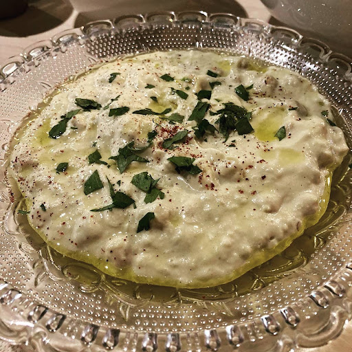 WHOLE ROASTED EGGPLANT: Eggplant roasted directly over an open fire, served with white tahini, amba tahini, chopped tomatoes and red onion all seasoned with aromatic herbs. Not just a beautiful dish, it tastes well!