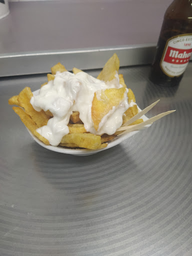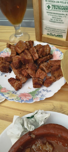 Read moreLas mejores bravas de todo Madrid, entré de casualidad por que me estaba cagando, para hacer gasto me pedí una jarra de cerveza y unas bravas, cuando termine de cagar atasqué el water, ni con la escobilla pude partir el mojón que salio por mi exclusa de salida, de la vergüenza que tenia me bebí la cerveza de un trago e iba a comerme las bravas a trote cochinero para irme lo antes posible, hasta que me metí la primera brava en la boca, DIOS!!!! que sabor y que textura, en su punto, hechas por dentro y crujientes por fuera, con un dorado que estoy seguro que si se las das de comer a un ciego le crecen los ojos solo por ver ese majestuoso dorado, tras comerme la ración, después me pedí otras dos más acompañadas de su respectiva jarra de cerveza, luego cogí el coche y me fui a casa pensando por el camino en el manjar q me acababa de comer y en el pobre q tenga q pelearse con el mojón que dejé en el baño, aunque con cariño seguro lo arreglan, aparte de que me extrañó que tres enanos con patillas estuvieran discutiendo por ver qué era mejor, si los zarajos o las alitas de pollo... En fin, repetiré pero pasado un tiempo prudencial no sea que...
