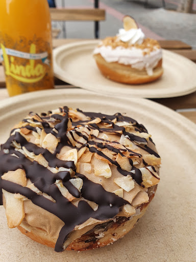I have been aware of this place for ages but never managed to call in. Today I did and I’m annoyed and delighted. Delighted that I called in and annoyed that I waited. The place looks nice and is welcoming and comfortable even during a plague. The chap running front of house ( Joel) was a sparkly eyed dreamboat and treated me and my girlfriend like heroes returning from a war. The coffee was delicious and the cups were cute. My partner had the pumpkin spice donut because she is young and American. I had the classic vanilla glaze because I am an unimaginative Brit. Both were brilliant. There are other nice vegan donuts knocking around Madrid but these were nicer. Joel gave us some absolutely gorgeous freebies too because we were new. I will become an absolute regular here and would have without the freebies. To get new regular customers during the apocalypse you have to be superb. This crew are that. Bagels, donuts, coffee, dreamboats. If you’re not into anything from that list there is a nearby river you can jump in to. Highly...