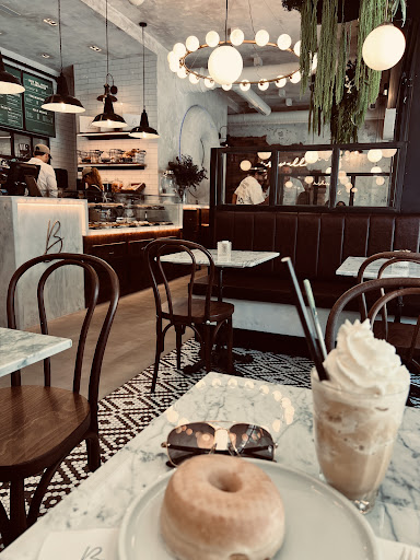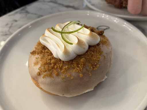 We decided to add one pistachio and one cream Brule donut to pair with our drinks after asking the bakers for recommendations. We found a table close to the window so we could people watch and settled in. It was semi crowded that day, but not too busy. The tables were marble with black accents. Very clean and warm at the same time.