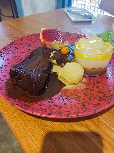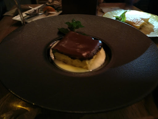 Llegados a este último punto, paso a comentar mi segunda experiencia en el restaurante, ya que, al acudir sin reserva, optamos por cenar en esta "zona de bar" con mesas altas. Hay que esperar a conseguir una mesa libre, confiando en la buena fe de otros clientes por respetar el orden de llegada. En nuestro caso tuvimos mucha suerte, ya que, aunque no conseguimos sillas (un grupo de unas 14 personas se había hecho con casi todas sin estar consumiendo gran cosa), sí que pudimos hacernos con una mesa en unos pocos minutos. Allí nos atendieron con servicio a mesa, preparándonos cubiertos y acercándonos las consumiciones de la barra. Aunque era un poco caótico para los camareros, pues la gente (tanto los que esperaban para hacerse con una mesa en esta zona, como los que tenían reserva pero tomaban algo para hacer tiempo) se agolpaban en la barra y en la puerta impidiendo el paso. Aún así, nos sirvieron con profesionalidad. Probamos la interesante oferta de hamburguesas (de jabalí, cochinillo, ternera madurada...). Estaban excelentes. Gran combinación de sabores para potenciar la carne que llevaban. Recomiendo la de cochinillo para aquellos que tengan antojo del mismo, pues es sabor puro de cochinillo metido entre dos panes. Para mayor sorpresa nos indicaron que también podían servirnos postres, así que degustamos nuevamente la parte más dulce y golosa de la carta.