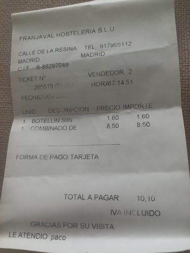 Read moreEmpezó muy bien pero cada vez nos tratan peor , vamos todas las semanas a comer una oferta del bocadillo. Todos los primeros de mes llegamos un pelín tarde porque tenemos que pagar una extraescolar de nuestras hijas. Ellos saben que venimos por la oferta y me han cobrado sin la oferta. Además saben que por mi dolor de rodilla necesito sentarme en la mesa. Y tampoco nos dejan una mesa son vestir para las comidas. No entiendo no cuidar a los clientes habituales por 7 euros habéis perdido un grupo de clientes fiel. Y si nos hubieran avisado no hubiéramos comido la oferta pero que os aproveche esos 7 euros de más, una pena, iba a venir a comer con mi marido un chuletón, pero yo si os queréis sentir como un bar de confianza, no vayáis porque por desgracia la encargada es muy...