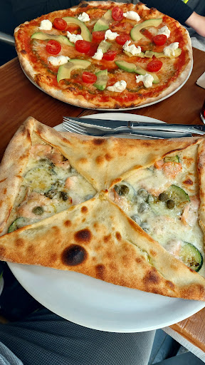 The pizza is also great, thin crust, not soggy on the bottom at all! You can get a half-and-half pizza so you don't have to decide between all the many flavours! I had no regrets with my 2 choices! They also have a spicy oil you can drizzle on. I started with a salad (I asked for no chicken) which was very good too (it's not easy finding veggies when on holidays I find). The atmosphere was great upstairs and downstairs is like a cozy funky cave! The music was pretty good too. I'd definitely come...