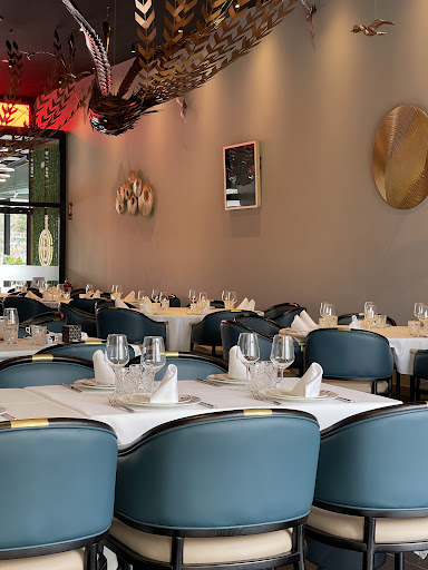 Para empezar, conforme advertimos la llegada al local, y ante nuestra mirada, tenemos una fachada modesta y sobria de un restaurante, que no nos advierte de lo profundo, amplio y elegante que es este recinto. Ésta integra exitosamente elementos decorativos clásicos y modernos (lámparas de araña blanca de metal, con brazos y lágrimas, bajo techos decorados con sendas molduras escayoladas). Los tonos blancos y grises pasteles predominan para dar vida a un espacio enorme que carece de ventanales. Decoran sus paredes cuadros con temas florales discretos, marinas y demás propuestas variopintas, armonizando con todo el conjunto. Separadores de cristal opaco y grabados demarcan aquellas zonas del centro del local, donde las mesas, en esa área, se encuentran muy juntas. Todo ello favorece, lógicamente, la privacidad y comodidad al cliente. La sillería, toda ella vestida ampulosamente, y las mesas, con manteleria blanca y color vino tinto intenso, desafían la estabilidad de los colores fríos pasteles de todo el ambiente, incluidos los pilares cubiertos de aluminio reflectante.