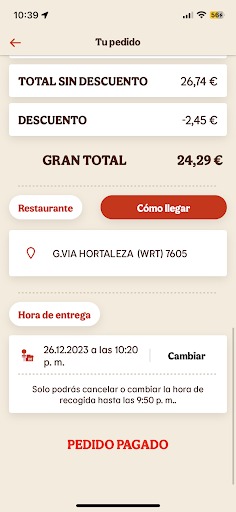 Read moreIndignante, acabo de realizar hace más de 40 minutos un pedido para recoger por ssu aplicación porque para comenzar slempre que quiero que hagan el delivery nunca llegan a mi casa no entiendo porque ya que estoy súper cerca a Gran Vía de Hortaleza y tengo que tomarme la molestia de ir hasta allá , realizo el pedido para recoger para sólo traerlo a casa y resulta que cuando lo recojo me dicen que mi pedido el cual ya me cobraron no les figura y que no me lo pueden entregar aún cuando tengo un correo que dice que está en preparación y tengo todos los pantallazos de la aplicación, como es posible que me quieran estafar cobrándome y luego diciéndome que no hay nada y encima de eso me hagan agotar las promociones que tenía acumuladas por mis coronas porque luego no mas pobre utilizar , como es posible que siendo cliente frecuente me cobren algo me hagan ir hasta el restaurante y no me entreguen lo que ya pague y lo peor aun es que se lavan las manos allí los trabajadores y no son empaticos para buscar una solución. Pésimo Servicio...