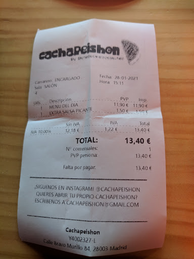 Read moreBuenas tardes, le doy una estrella xq no me deja poner menos. El sábado por la noche, les llamé para realizar un pedido, cierto es que cuando me dijeron el precio total me pareció un pelín caro y le dije que lo tenía que consultar, lo consulté y les volví a llamar para confirma el pedido. Como a los 40 minutos de haber realizado dicho pedido (que como opinón personal, ya debería haber estado en mi casa) me dicen que uno de los quesos que llevaba una de las cachapas, no lo tienen y que si me importa que me lo cabien, les dije que no había problema, pues 30 minutos despues de esa llamada les vuelvo a llamar para ver que pasa con el pedido y me dicen que el repartidor había salido hacia bastante rato y que ya debería habernos llegado, me vuelven a pedir el número de teléfono para que me llame el repartidor y 10 minutos depues de esa llamada, me llama el repartidor que está en la calle paralela a la que tenia que entregar el pedido, pero que no sabía llegar, le explico como hacerlo y SORPRESA, 15 minutos depues vuelvo a llamar al restaurante, xq aún no tenemos nuestra cena, y como me puse bastante seca por teléfono (pero os aseguro que no levante la voz ni lo mas mínimo) la señorita en cuestión no solo no fue capaz de pedir disculpas, si no que además me colgó. Lamentablemente será un restaurante que no probaré y ciertamente es una pena, xq yo tengo un negocio y creo que así no se debe tratar aún cliente que estuvo esperando el pedido...