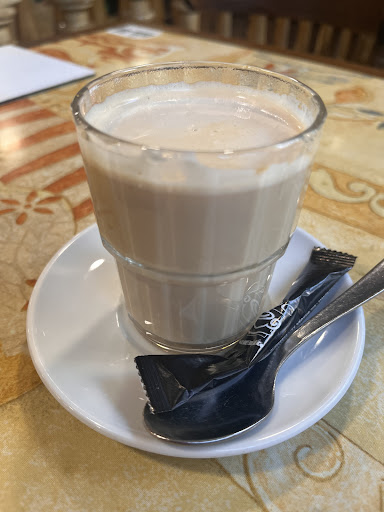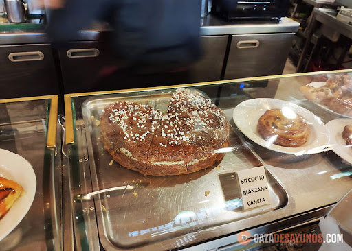 Veo gente comiendo porras, cruasán, tostadas, tortilla, bocadillos… y dado que en la carta la oferta es bastante genérica, pregunto en barra y me dejo asesorar. Elijo un cola cao y un bizcocho de manzana y canela, que está súper esponjoso (2,7 euros). Buenísimo. Me quedo con pena de no probar las tostadas, ya que tienen un surtido amplio de mermeladas caseras. También tostadas con tomate, bizcocho de yogurt, sandwiches, tortitas…...