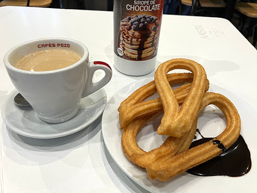 I felt a little bad to step into obviously a local joint. But it was so comfortable with no frills with very good drink and food, I went back for the second time. On my first visit, I ordered cafe con leche with churros. It was good! Nothing fancy and a big bottle of what must be the Spanish version of Hershey's chocolate syrup was put on my table. But they were good! On the second visit, I ordered potato omelet, orange juice, and tea. The omelet was thin and flat, not the famous "tortilla", but tasted better than most I tasted elsewhere's tortilla! Also, unexpectedly, the orange juice was fresh squeezed and great. And lastly, their prices are honest. No touristy mark ups. Busy place is kept by hard working old man and very beautiful (but doesn't smile much) lady. If she gives you a smile, consider it as...