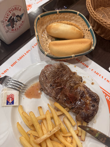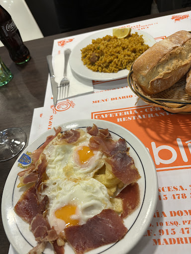 Read moreMás de las 3 de la tarde. Me topo con este restaurante cafetería donde publicitan aparte del menú del día, plato del día (medio menú). No tengo mucha hambre, me parece bien. Antes de acabar de abrir la puerta me aborda una señora que me vende el oro y el moro, cualquier plato del menú, primero o segundo, pan y bebida (agua, vino, cerveza...) por 9,80. Madrid, calle Princesa, estupendo. Entrecote con patatas y vino tinto (botella entera para mi). El vino prometía (y cumplió) acidez severa de estómago si habías olvidado el omeprazol por la mañana. El entrecote, crudo por dentro, cocido por fuera, a esa plancha le faltaba un plus. Menos mal que a mi la carne me gusta poco hecha, que si no... El camarero correcto, sin más. El de la plancha, que estaba detrás de la barra, tenía cara de perdonarle la vida a los clientes, no sé de qué estrella Michelín acabó en este "restaurante" de tercera. Para no repetir,...