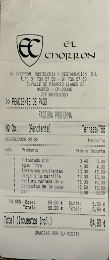 Read more"¡Experiencia gastronómica impresionante en El Chorrón! Los fingers de pollo estaban crujientes por fuera y jugosos por dentro, con un sabor intenso y sabroso. La oreja a la plancha, perfectamente cocinada y con un sabor profundo y carnoso. Las berenjenas fritas con miel eran una sorpresa dulce y salada, con un equilibrio perfecto de sabores. Los calamares fritos, frescos y tiernos, con una textura crujiente y un sabor a mar que nos encantó. La ensalada de Chorrón era fresca y vibrante, con ingredientes de alta calidad y un toque de originalidad. Y los chopitos fritos, pequeños y deliciosos, completaban la experiencia con un toque fresco y marino. Pero lo que realmente hacía destacar a El Chorrón era su terraza gigante y acogedora, un espacio perfecto para disfrutar de la comida y la compañía en un ambiente relajado y agradable. Y el toque final fue la excelente atención de Verónica, nuestra camarera, que nos hizo sentir como en casa. ¡Recomendado 100% para los amantes de la comida...